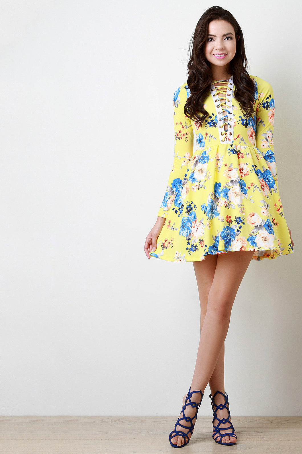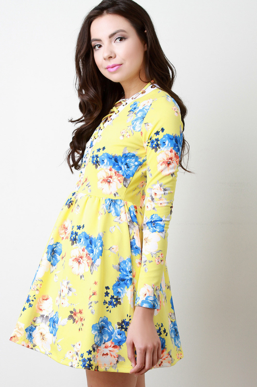 This vibrant dress features a beautiful floral print, lace-up plunging v-neckline, longsleeve construction, and soft stretchy knit. Flared skirt, finished with mesh underlay. Accessories sold separately. Made in U.S.A. 95% Polyester, 5% Spandex.