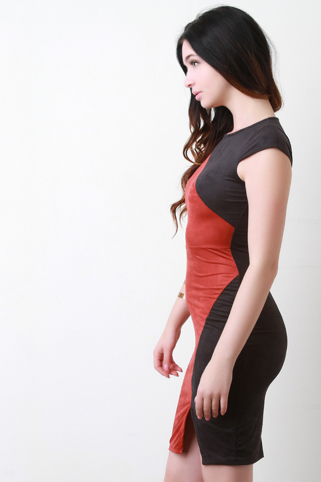 This bodycon dress features a soft faux suede fabrication, round neckline, short cap sleeves, high waisted cinched seam, diagonal contrasting panels, front vent slit, and zipper back. Accessory sold separately. Made in U.S.A. 95% Polyester, 5% Spandex.