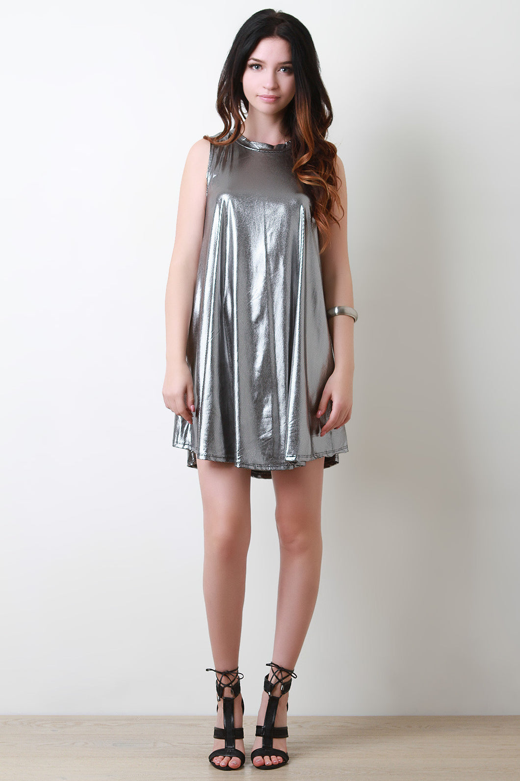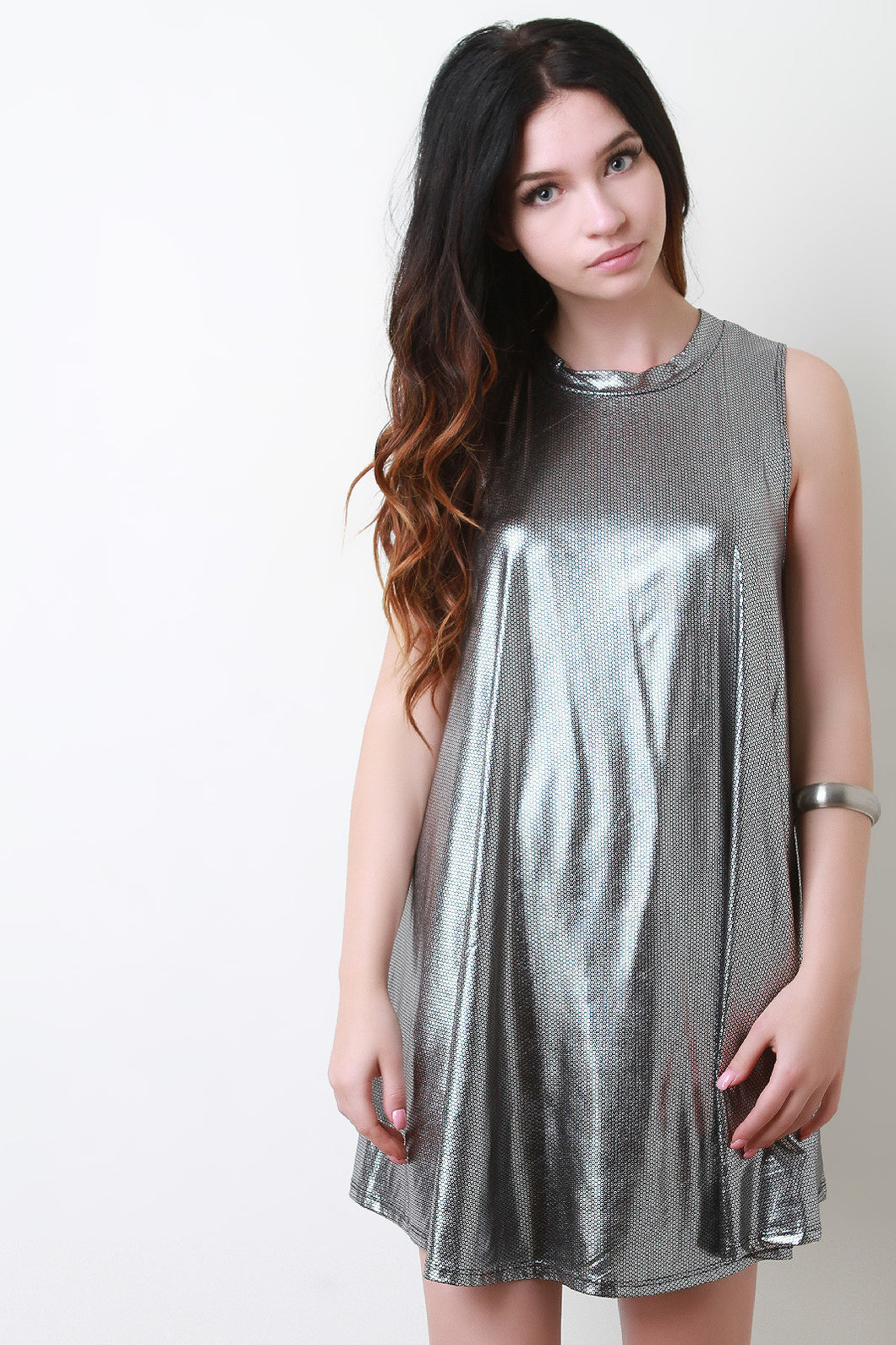 This dress features a metallic sequins inspired pattern, sleeveless, mock neckline, trapeze cut fit, and mini length hem. Accessory sold separately. Made in U.S.A. 92% Cotton, 8% Spandex.