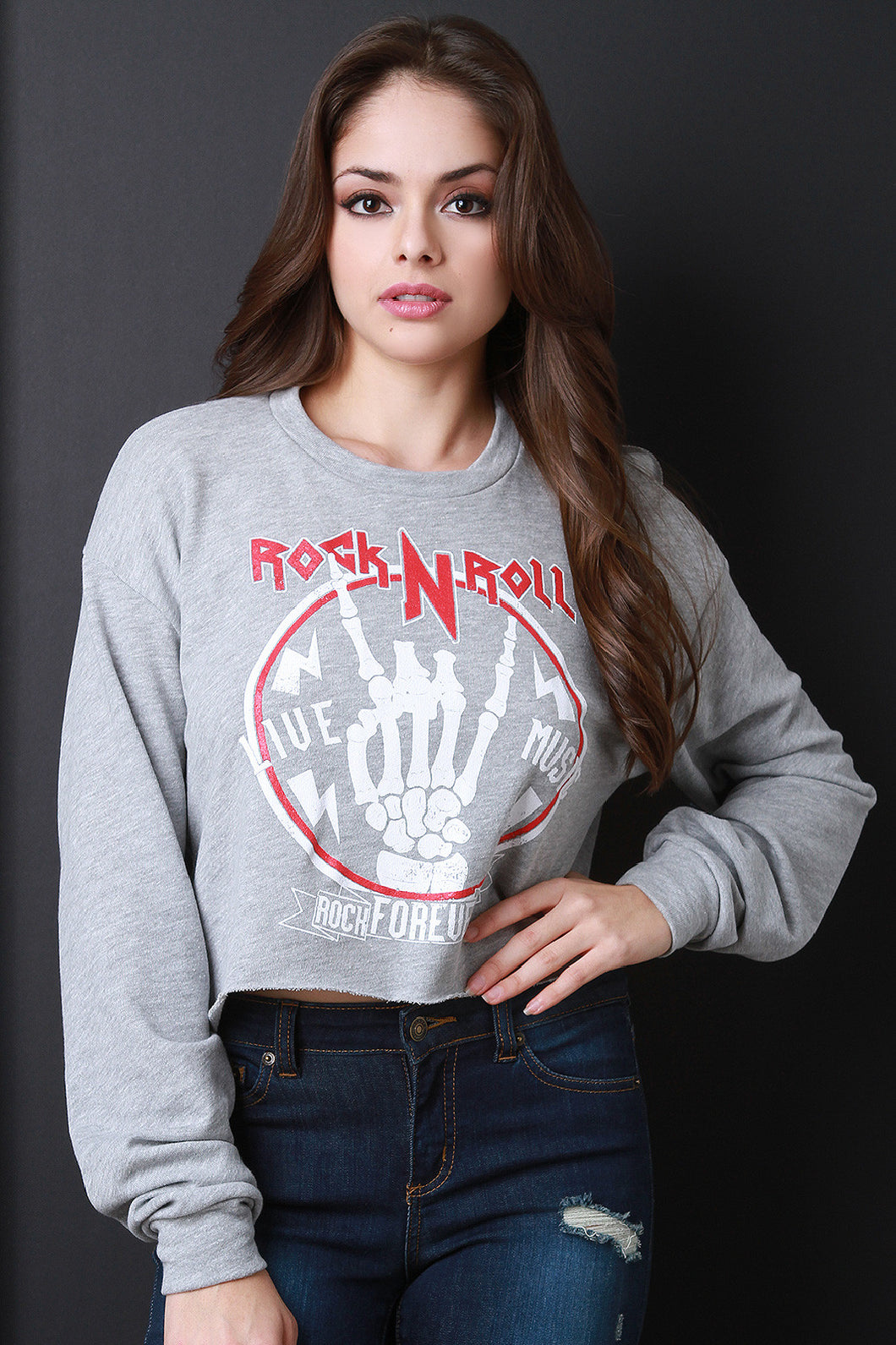 This sweater top features terry knit, graphic print, round neck, long sleeves, shredded back, and cropped raw edge hemline. Accessories sold separately. Made in USA. 88% Cotton, 12% Polyester.