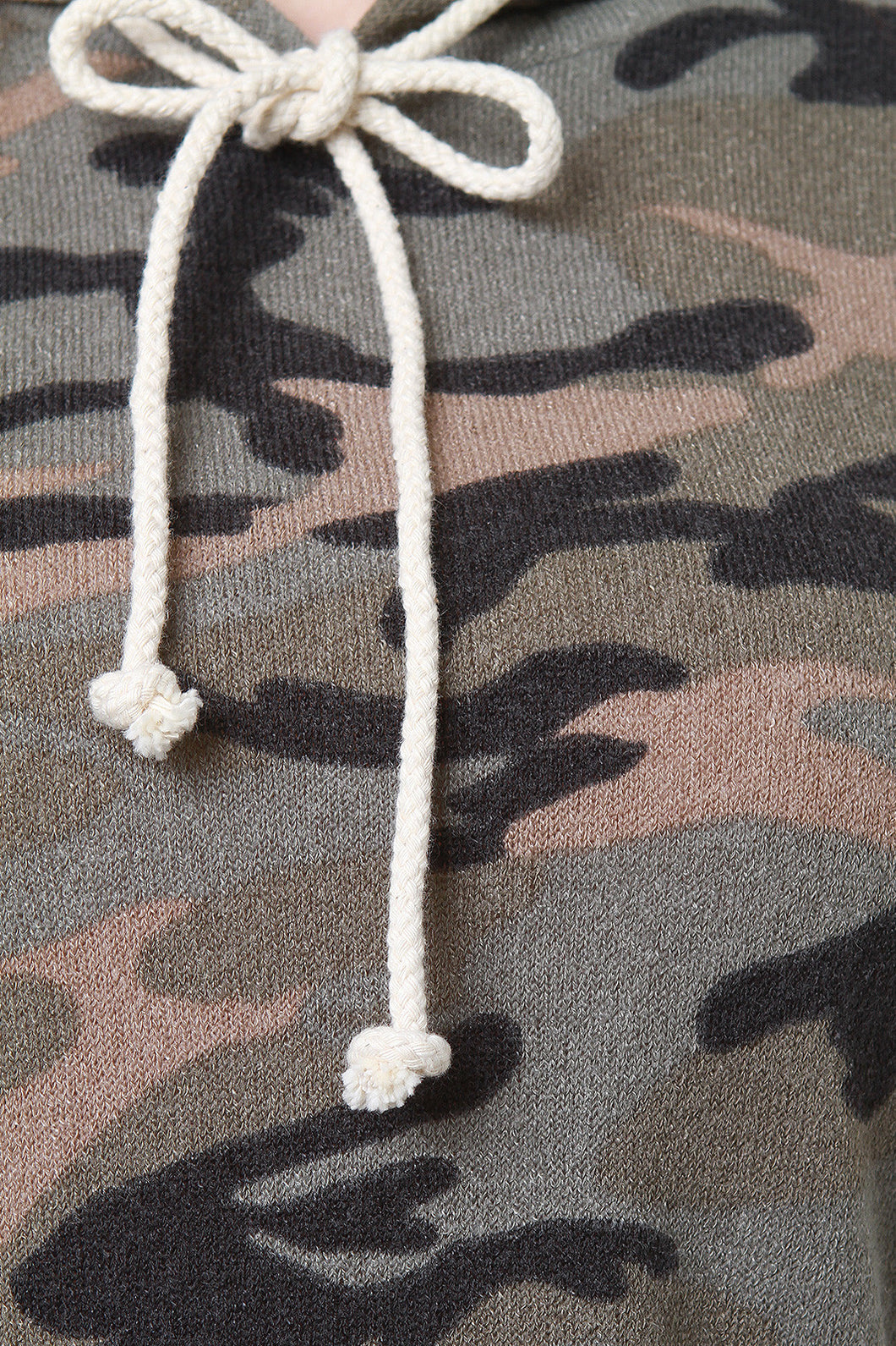 This sweater top features soft camouflage knit, hooded neckline, self-tie drawstring, long sleeves, and rib knit trim. Accessories sold separately. 96% Polyester, 4% Spandex.