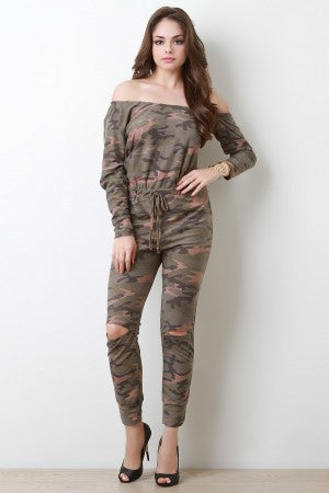Off The Shoulder Camouflage Cut Out Knees Jumpsuit