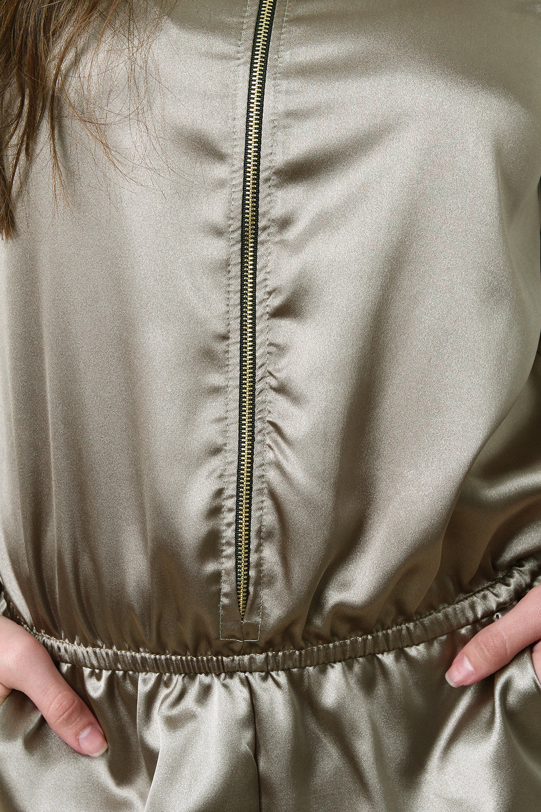 This playful jumpsuit features a satin fabrication, zipper front to a stand-up collar, long sleeves, elastic cinched waist, jogger cut legs, and side pockets. Accessory sold separately. Made in U.S.A. 92% Polyester, 8% Spandex.
