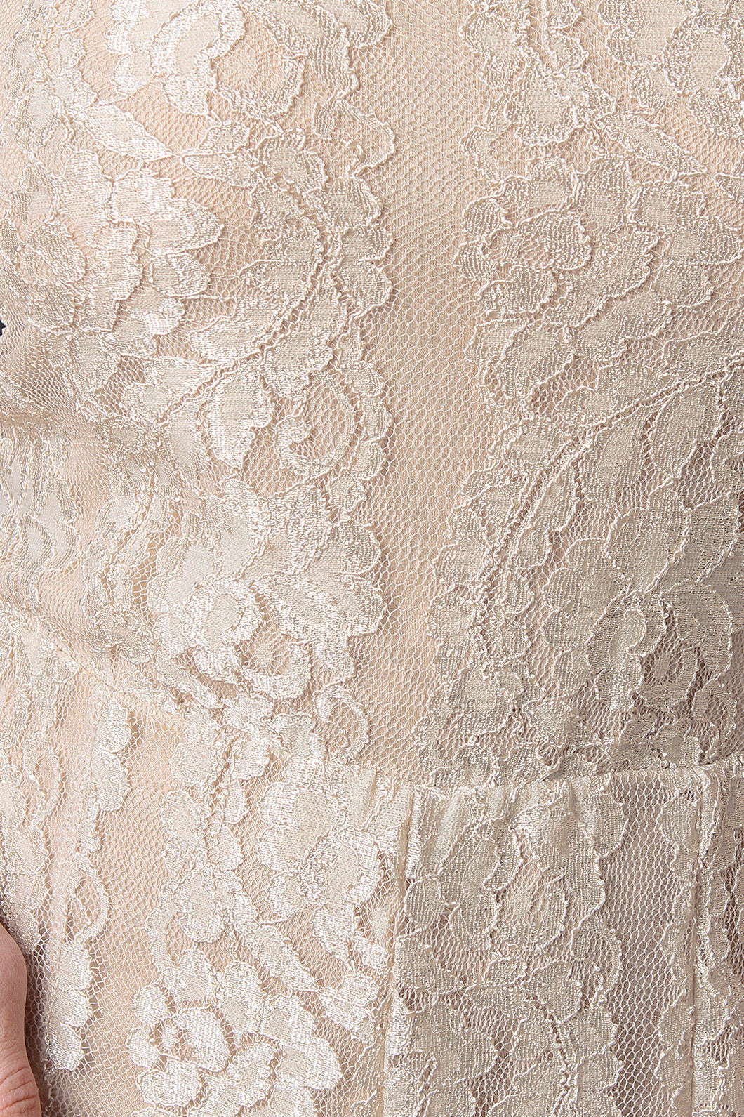 This jumpsuit features floral lace fabrication, mock neck, sleeveless construction, high slit detail, and back keyhole with double button closure at nape. Accessories sold separately. Made in U.S.A. 95% Polyester, 5% Spandex.