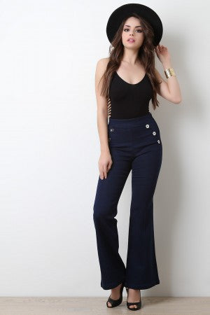 These palazzo style pants , feature a high-waist and wide flare bottoms. Designed with crease accents, decor buttons, and illusion non-functional pockets. Finished with an adjustable zipper on the side. Self: 65% Cotton, 33% Polyester, 2% Spandex.
