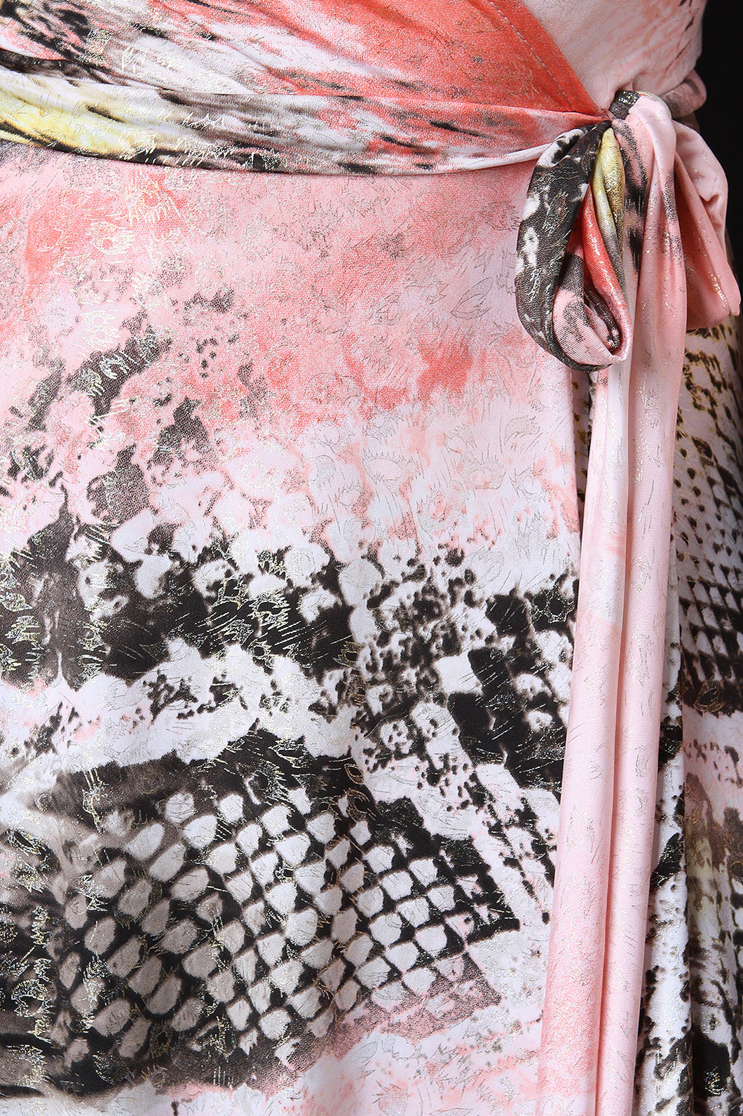 This maxi dress features smooth stretch fabric, mixed print, surplice neckline, long sleeves and a self-tie waist sash. Accessories sold separately. Made in U.S.A. 95% Polyester, 5% Spandex.