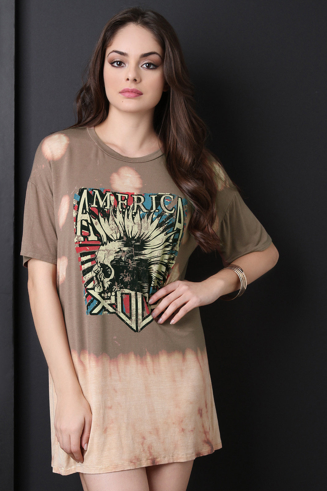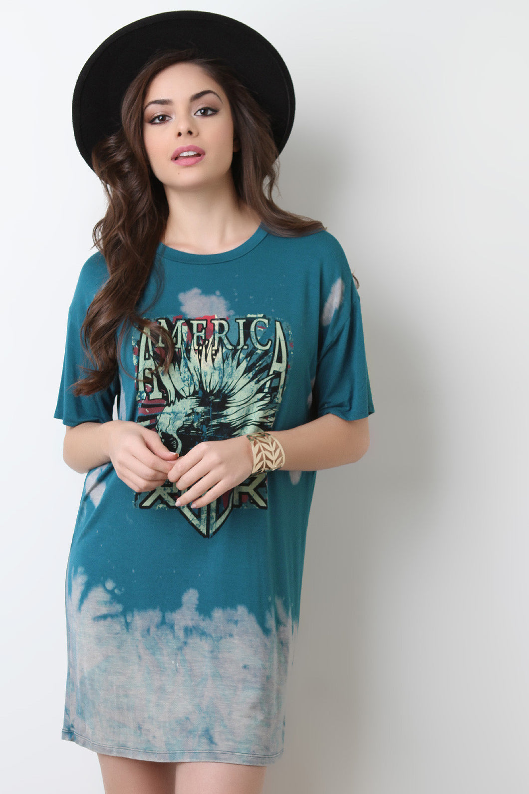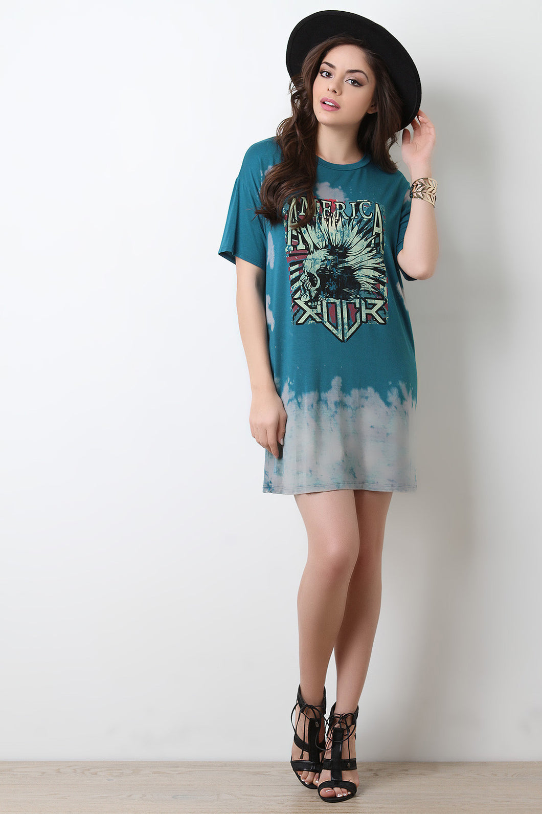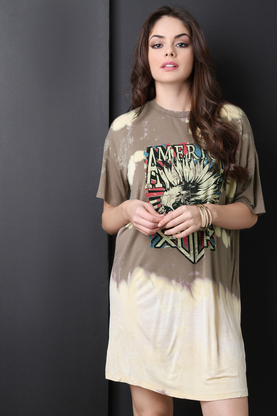 This dress features a t-shirt inspired design, bleached jersey knit fabrication, crew neckline, short sleeves and America rock graphic print at front. Accessory sold separately. Made in U.S.A. 95% Rayon, 5% Spandex.