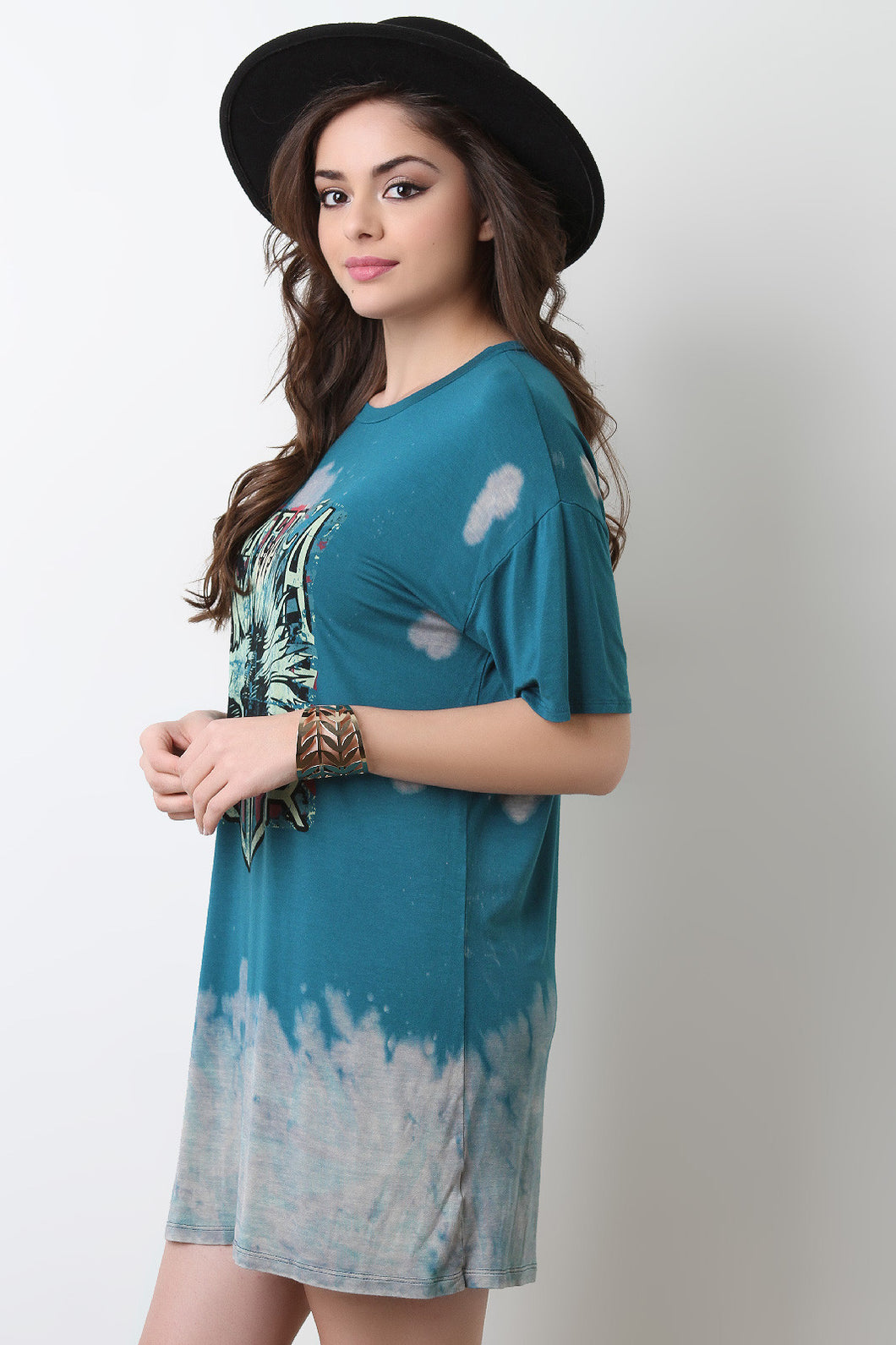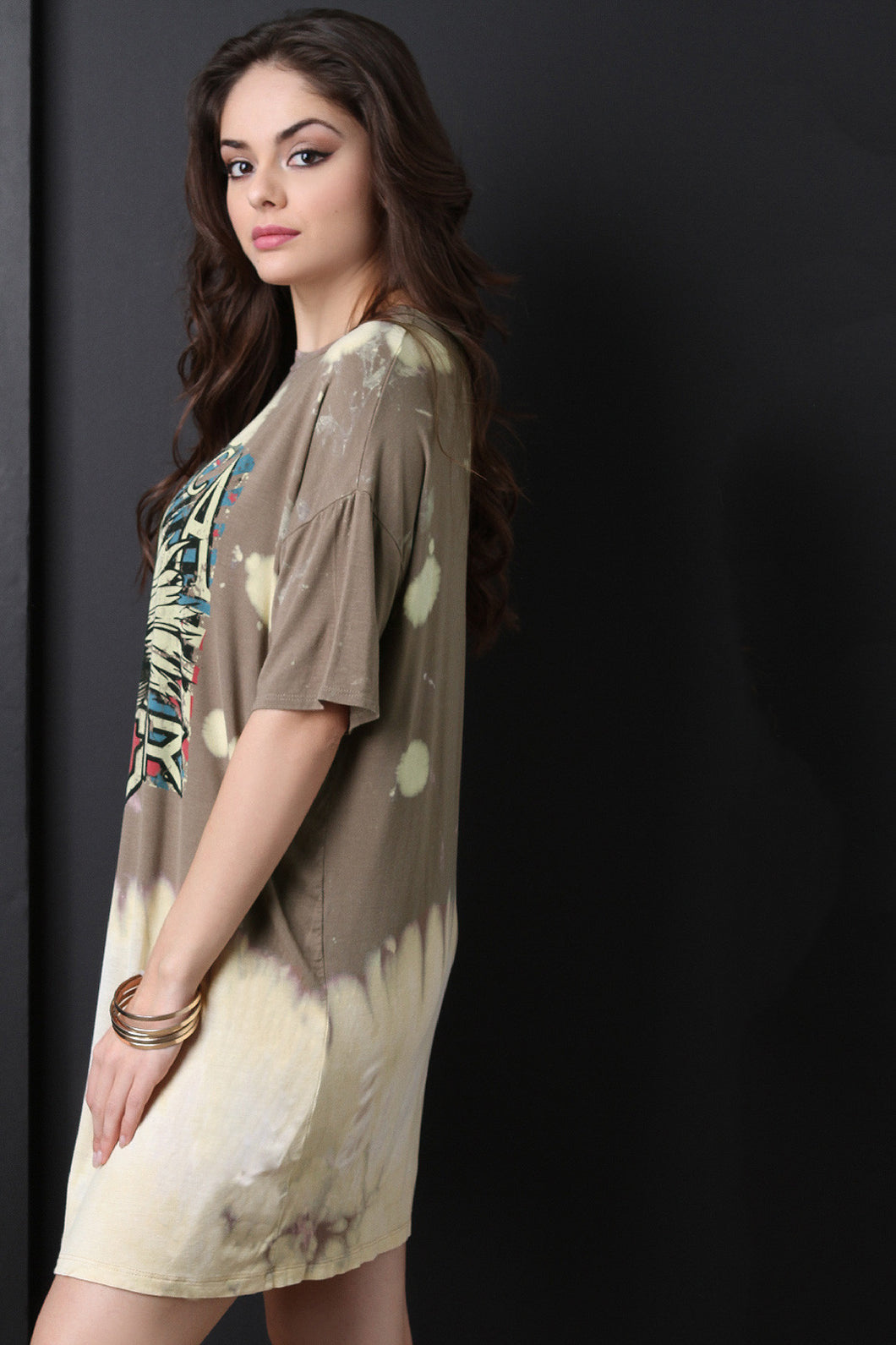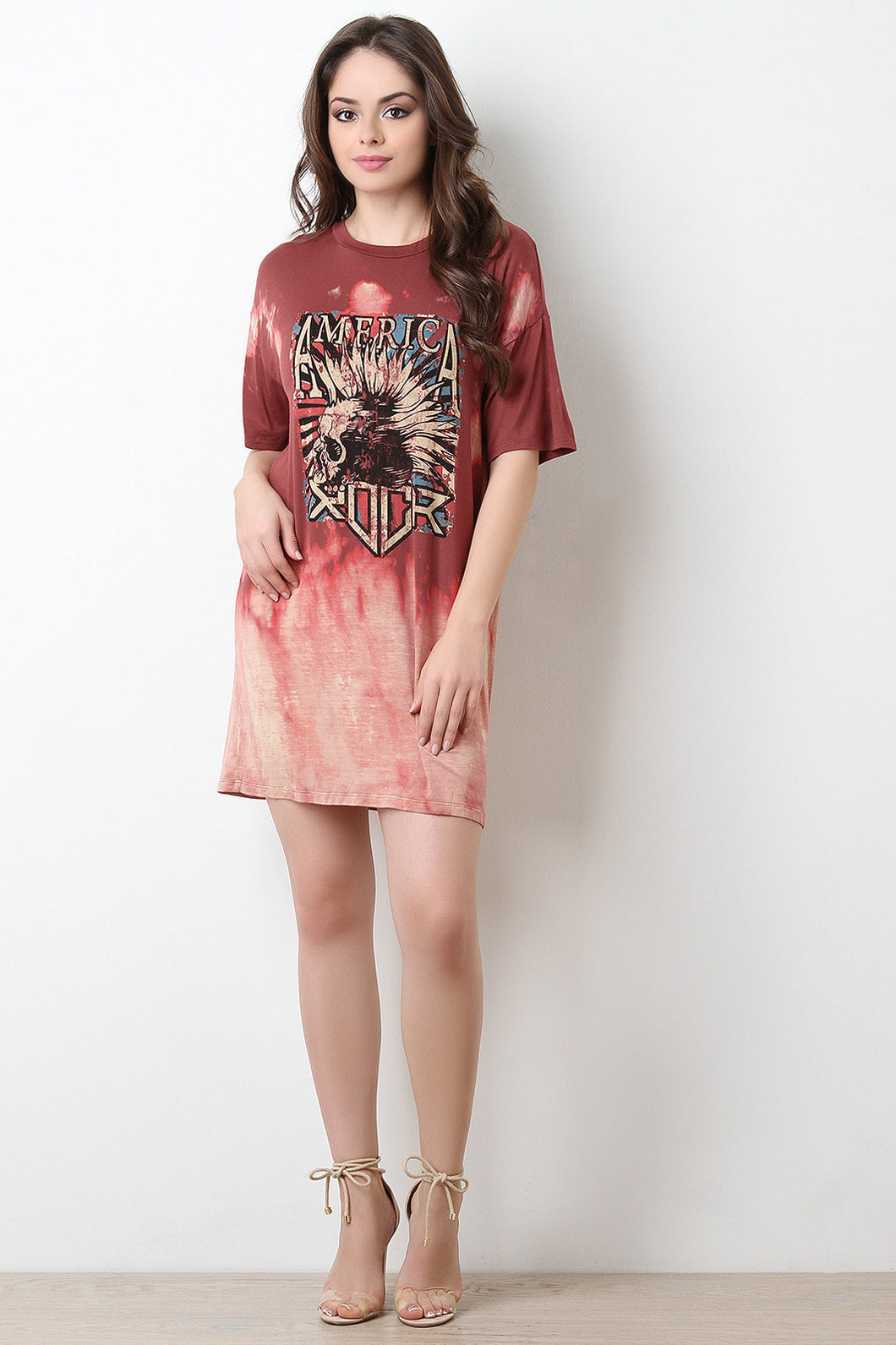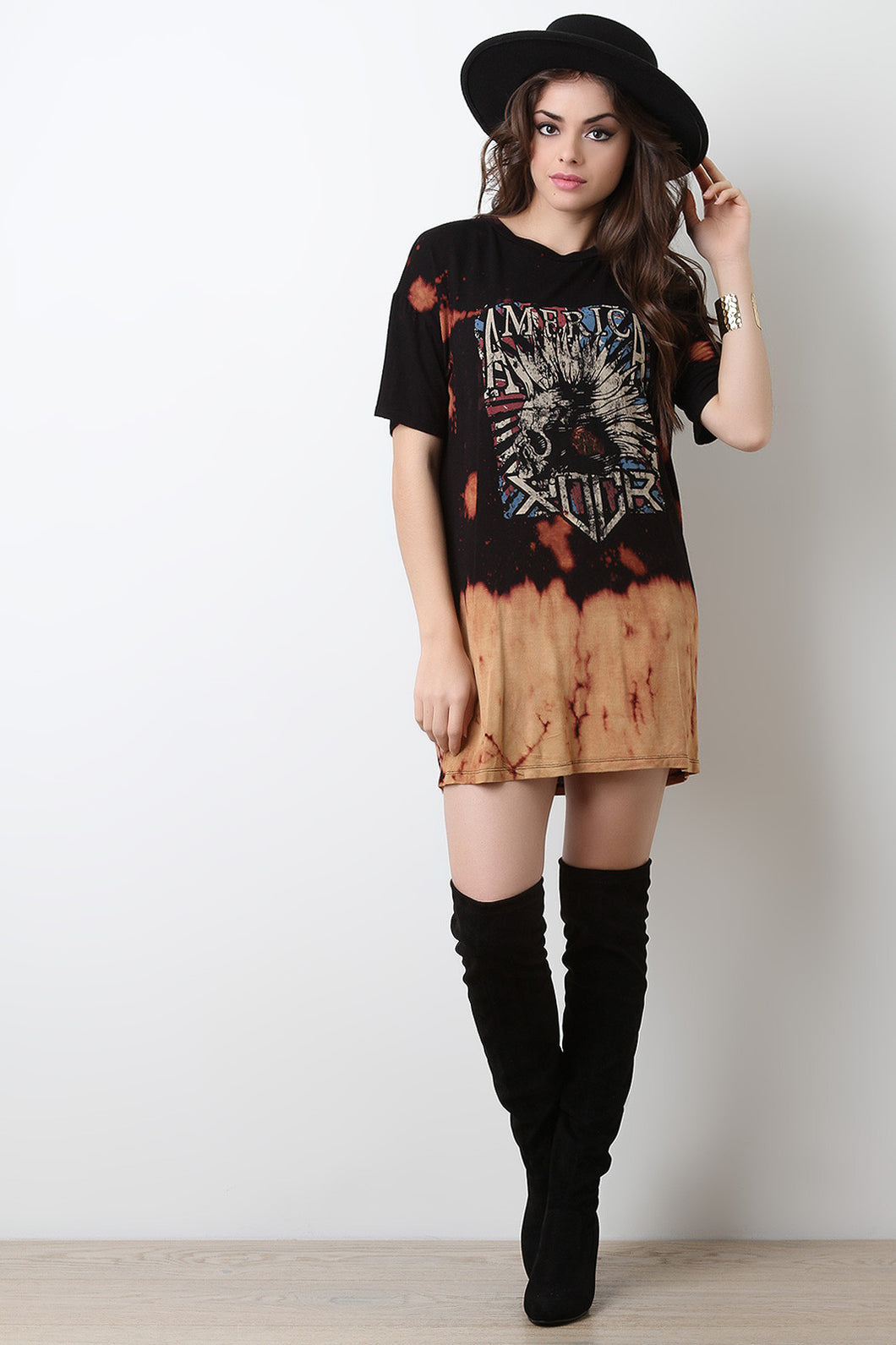 This dress features a t-shirt inspired design, bleached jersey knit fabrication, crew neckline, short sleeves and America rock graphic print at front. Accessory sold separately. Made in U.S.A. 95% Rayon, 5% Spandex.