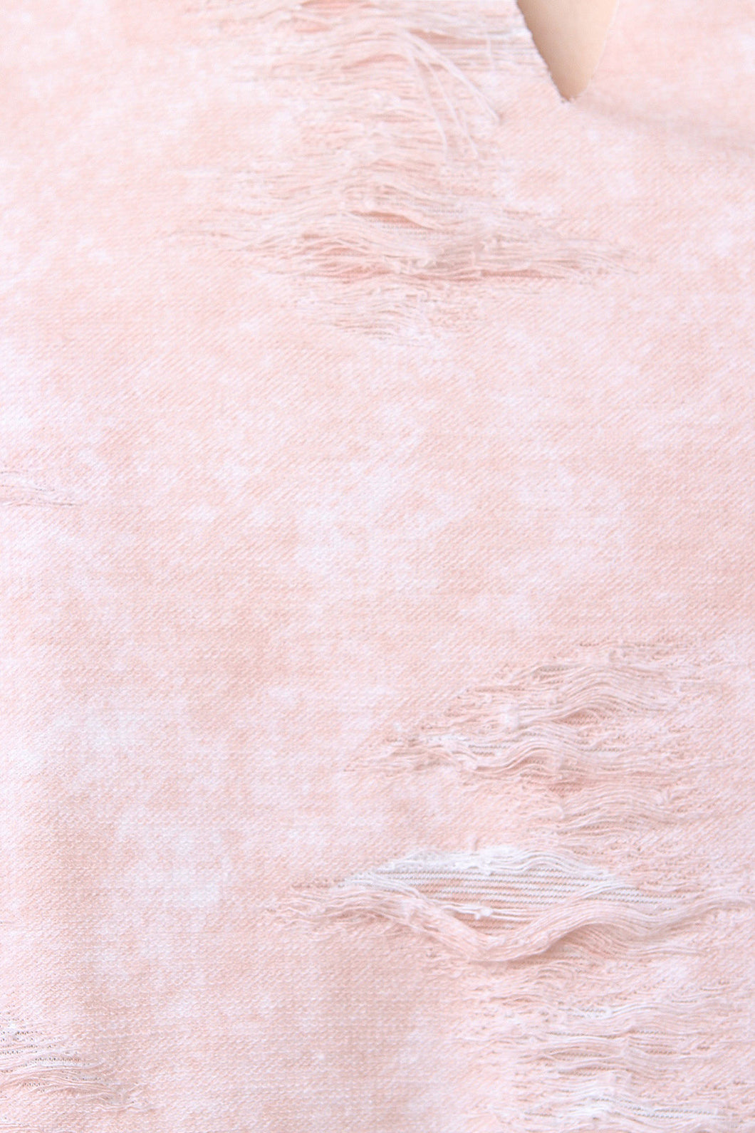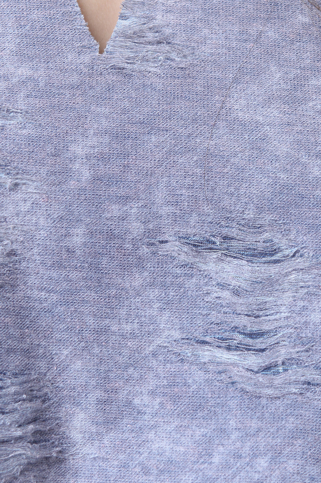 This crop top features a raw v-neckline with a choker band, distressed shredded details, and short sleeves. Accessories sold separately. Made in U.S.A. 42% Polyester, 35% Cotton, 20% Rayon, 3% Spandex.