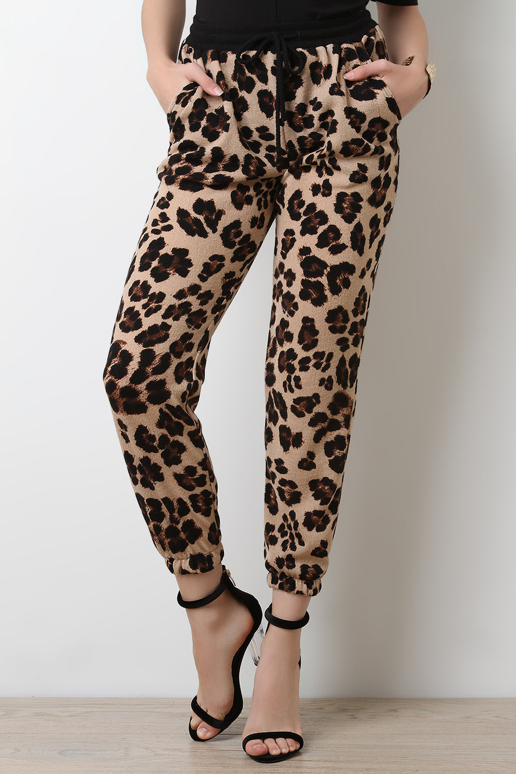 These jogger pants feature a leopard print, french terry knit, elasticized waist, self-tie drawstring, front pockets, and elasticized ankles. Accessories sold separately. 96% Polyester, 4% Spandex. Contrast: 63% Polyester, 33% Rayon, 4% Spandex.