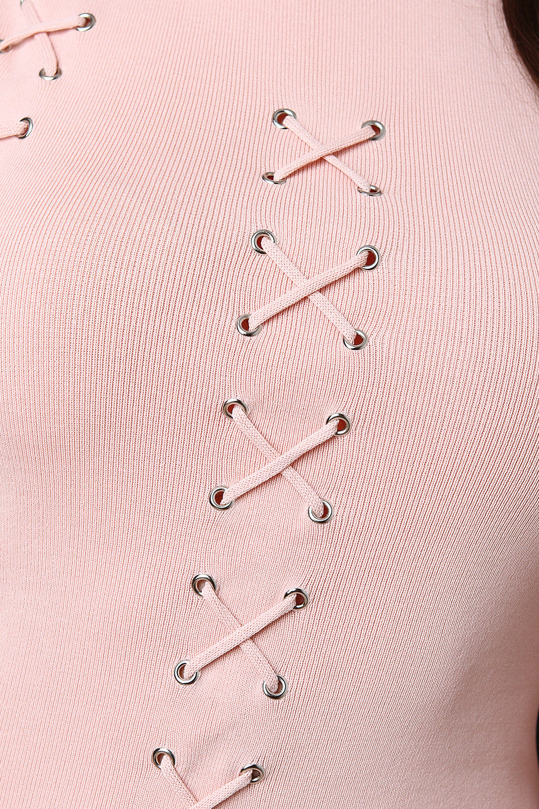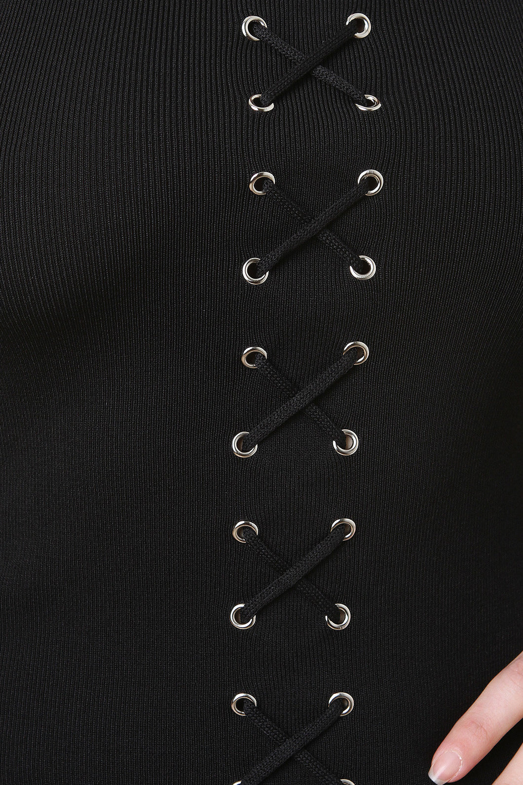 This midi dress features ribbed stretch knit, mock neck, criss cross lace up accents, and sleeveless construction. Accessories sold separately. 80% Viscose, 20% Nylon.