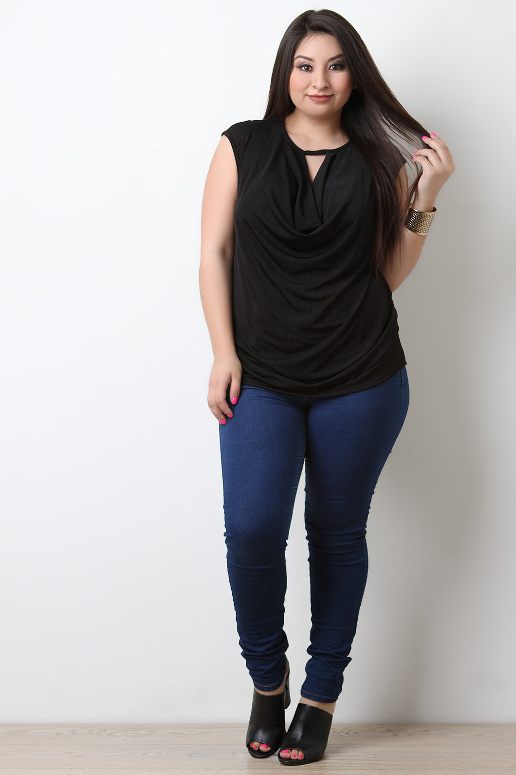 This plus size top features textured fabrication, a round neckline with draped keyhole front design, cap sleeves, and ruched sides. Accessories sold separately. Made in U.S.A. 95% Polyester, 5% Spandex.