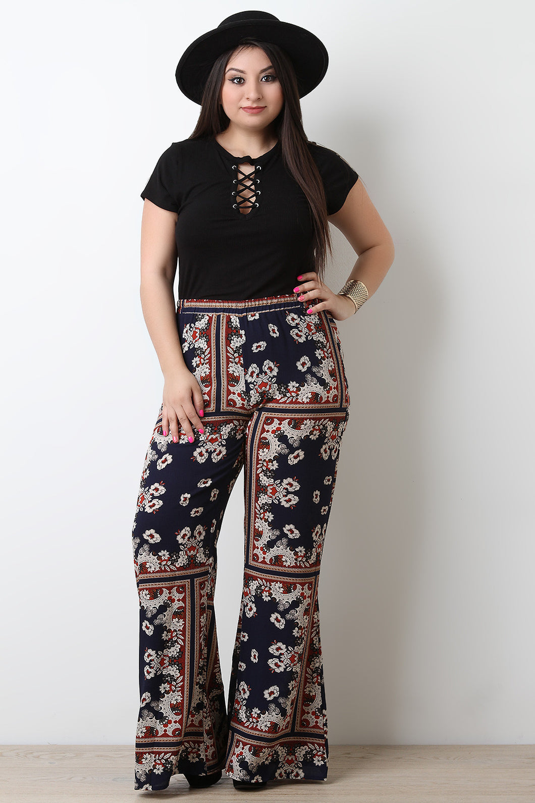This plus size top features a round neckline, grommets with corset style lace-up design, short sleeves, and straight hem. Accessories sold separately. Made in U.S.A. 96% Rayon, 4% Spandex.