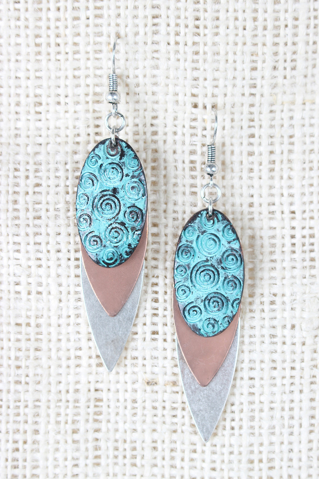 These layered dangle earrings feature a brushed metal finish, angular oval drop design, multi-colored, etched spiral design and finished with a fish hook.