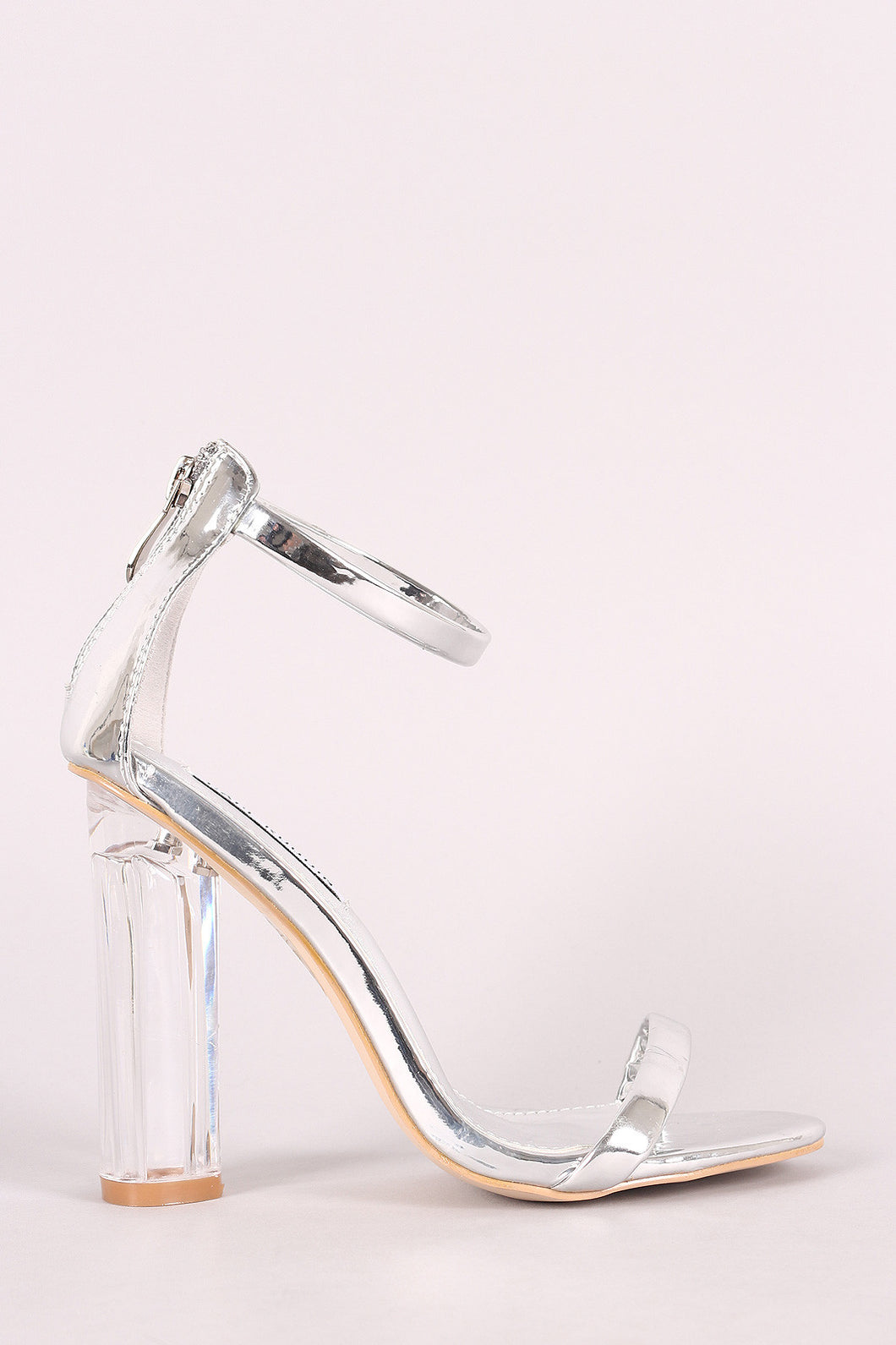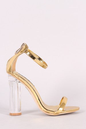 These gorgeous heels feature a shiny mirror metallic design, chunky lucite heel, and open toe silhouette. Completed with a cushioned insole, enclosed back, and rear zipper closure.